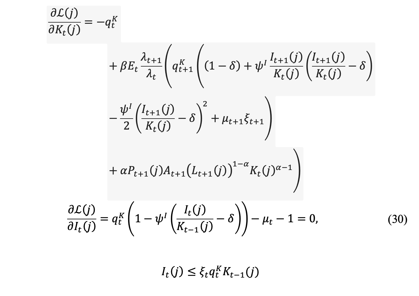 I also don’t know how to detrend these three FOCs for capital, investment, and the credit constraint (photo 2). Suppose that for investment, the decomposition into trend and cycle looks like (I_t = A_t \cdot i_t), and for capital (K_t = A_t \cdot k_t). But for these three variables, I don’t understand how to decompose them: (q^k_t) – the price of capital, (\mu_t) – the Lagrange multiplier for the credit constraint, and (\xi_t) – the borrowing limit. I model (A_t) as a non-stationary process.