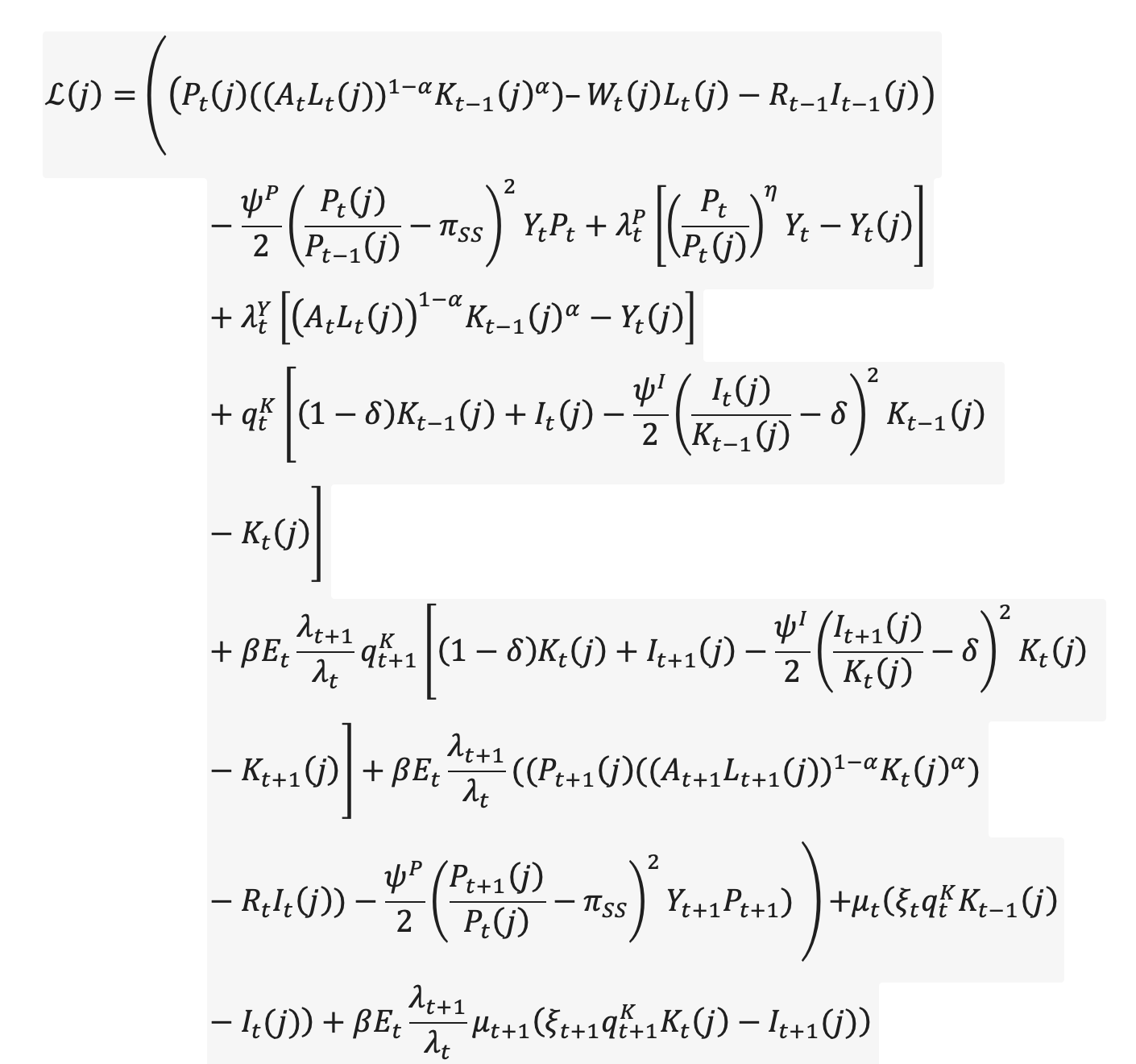 Thank you very much for your help! I have a question regarding detrending in DSGE models. I have the following Lagrangian, which is shown in the photo below. I don’t understand how to decompose (q^k_t) and (\mu_t) into trend and cycle components in order to perform the detrending process, and also (\xi_t) (which, in my opinion, should not have a trend).