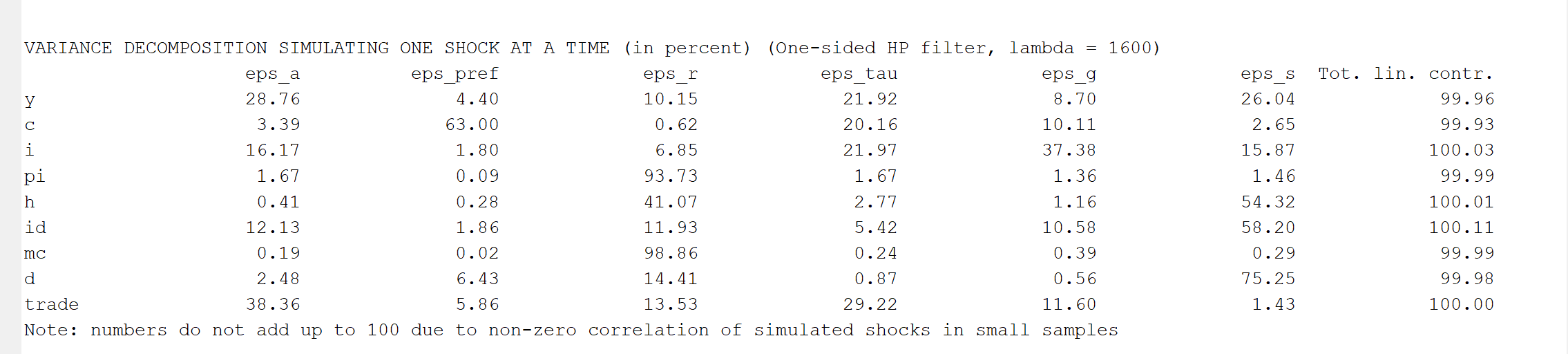 The sum of the numbers in the shock decomposition does not equal 100. In your previous response, you suggested using theoretical moments when periods=0 . However, I would like to know whether, if I insist on using simulated moments, I need to provide an explanation for why the sum of those numbers does not equal 100. Additionally, regarding the one-sided HP filter option, should I employ it? This is because I prefer the results obtained when the HP filter is applied.