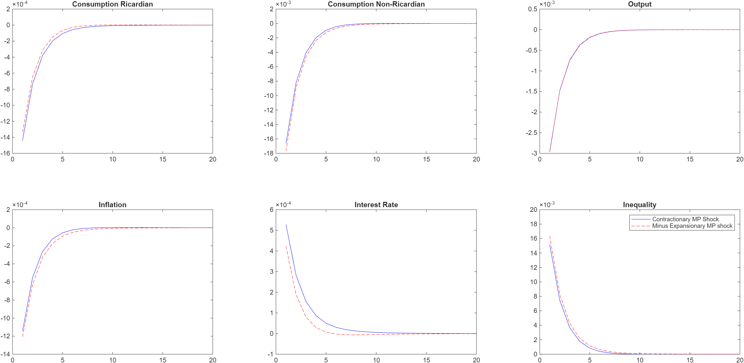 I was following codes given by Prof. Pfeifer on their website to arrive at asymmetric response of variables to an expansionary and contractionary monetary policy shock using GIRFs but in a two agent model.