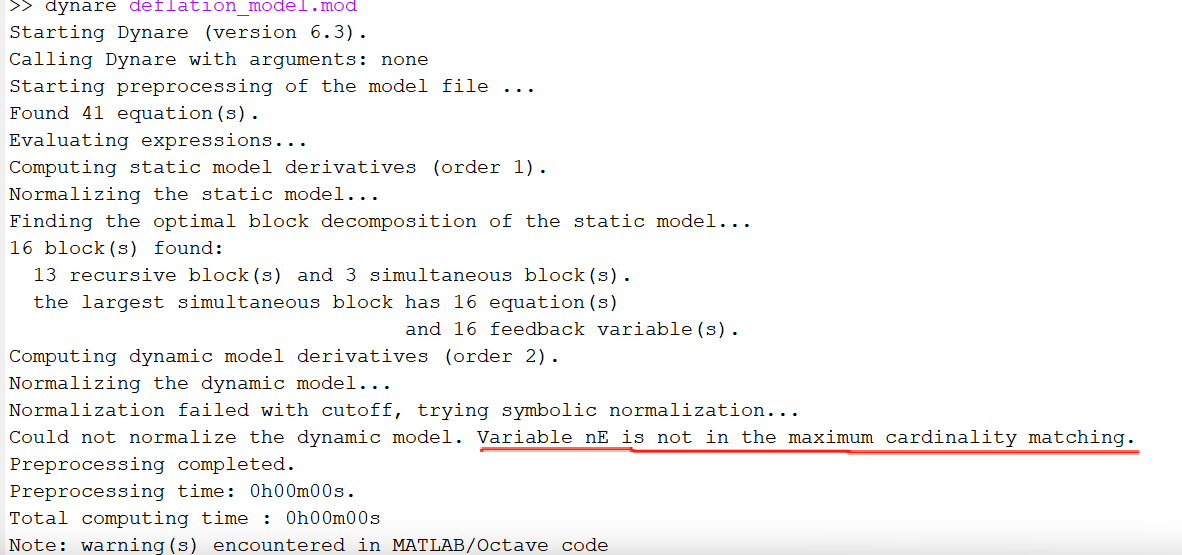 How to figure out while dynare’s outcome showed “Variable nE is not in the maximum cardinality matching”?