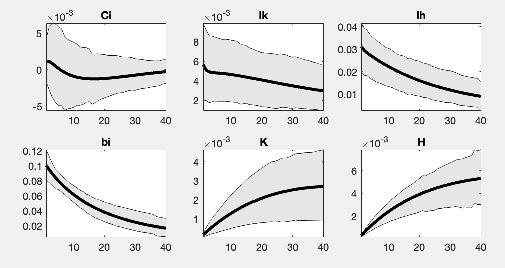 I am estimating a DSGE model using Bayesian methods, and I find that for some variables (for example, Ci in the attached figure), the impulse response function (IRF) often crosses the zero axis — meaning that the 90% credible interval includes zero for most horizons.