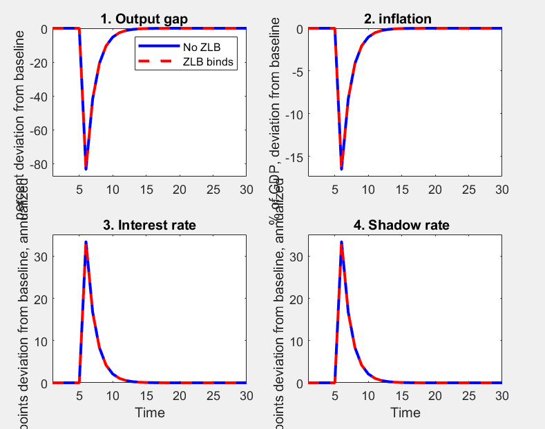 However, the IRFs of a positive monetary policy shock I obtained—shown in my earlier figure—are identical across the ZLB and non-ZLB simulations. This confused me, because the responses should differ once the constraint binds. I am wondering whether I may have mis-specified the ZLB constraint in OccBin, and I would be extremely grateful if you could offer any suggestions on how to diagnose or correct this issue.