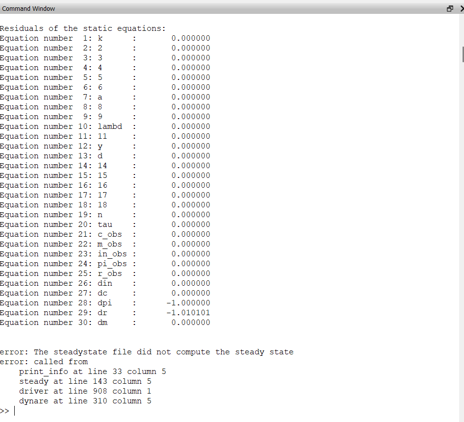 warning: Some of the parameters have no value (lne, lnz) when using initial_estimation_checks. If these parameters are not initialized in a steadystate file or a teady_state_model-block, Dynare may not be able to solve the model. Note that simul, perfect_foresight_setup, and perfect_foresight_solver do not automatically call the steady state file.