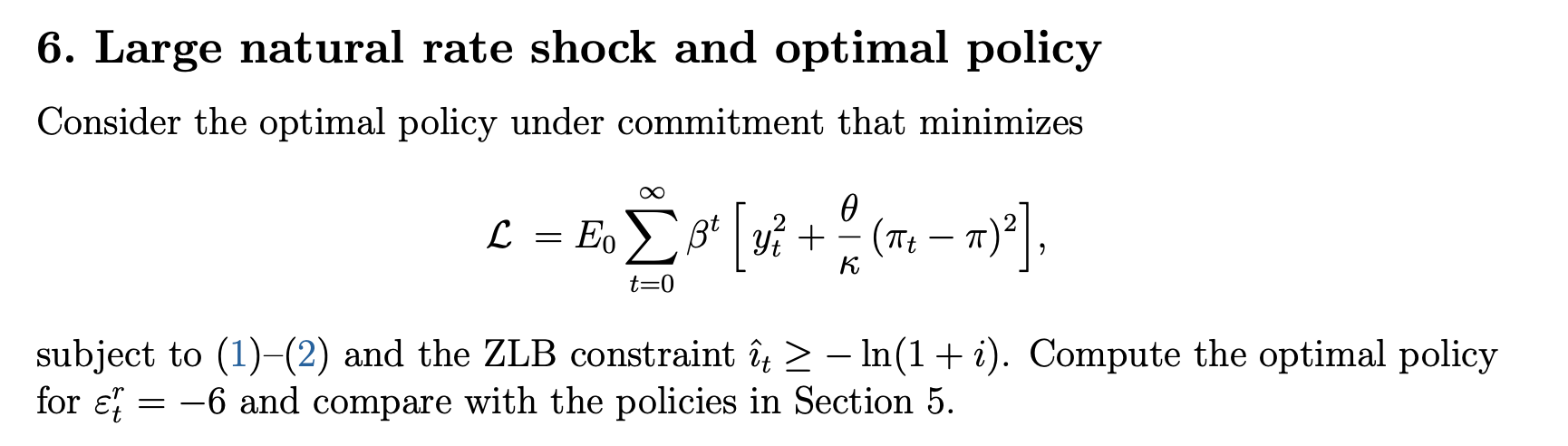 Hello, I am sorry if my question is somewhat trivial, but I am doing my master’s and am new to dynare especially to problems minimizing a loss function of a planner. In the screenshot I provide my exercise (1 and 2 are the standard IS and NK Phillips Curve)