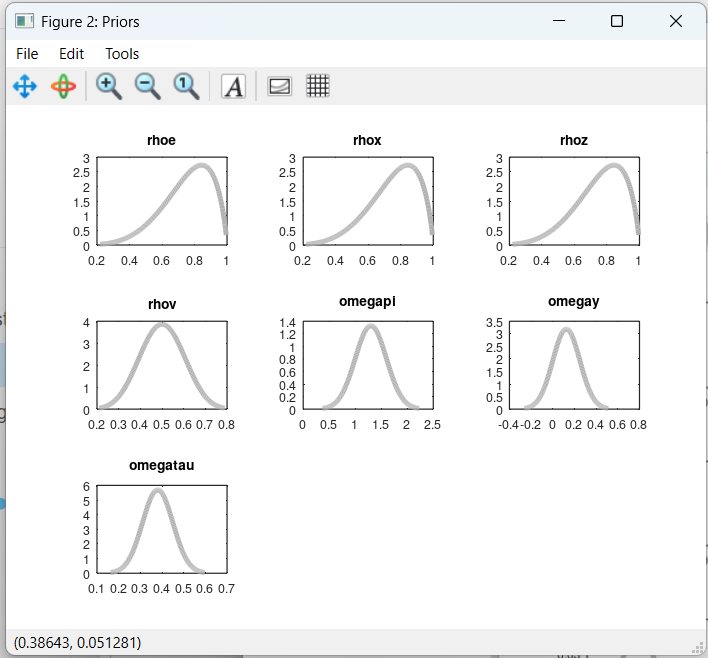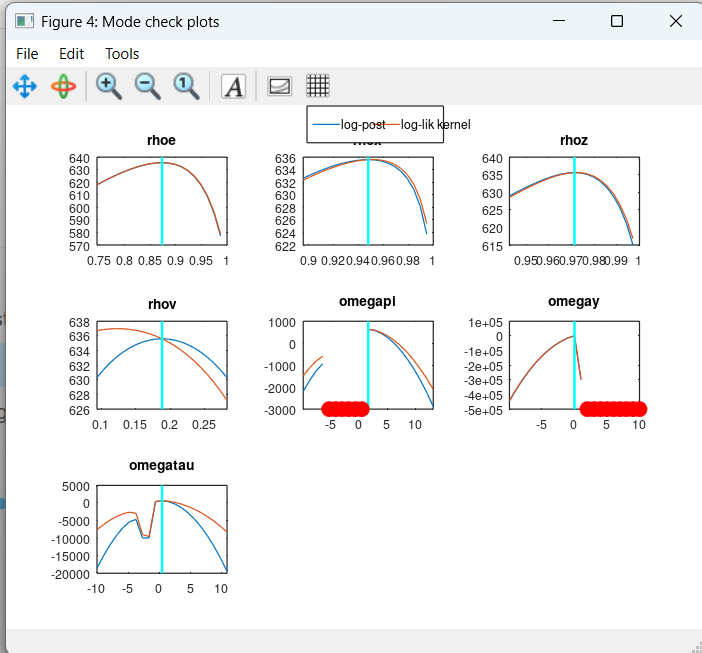 “First, we try to estimate the DSGE model using a classical maximum likelihood approach to inference. Technically this is done by a Kalman filter approach. To run the Kalman filter procedure, initial values for the parameters of interest must be specified, however. Because likelihoods can have several peaks, we use multiple starting values. We do this to make sure that we indeed estimate the parameters that maximize the likelihood (or, in our case, minimize the negative log-likelihood, which is equivalent). To implement this, we set up a loop that performs 2,500 different draws of vectors of starting values. This takes some time (several hours). Of course, you can reduce the number of draws and therefore the computational time. All this is done by running the script “run.m” placed in the folder “Searching for Starting Values - Full Sample”.”