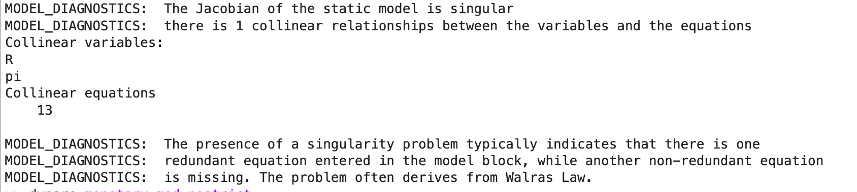 , it shows MODEL_DIAGNOSTICS: The Jacobian of the static model is singular