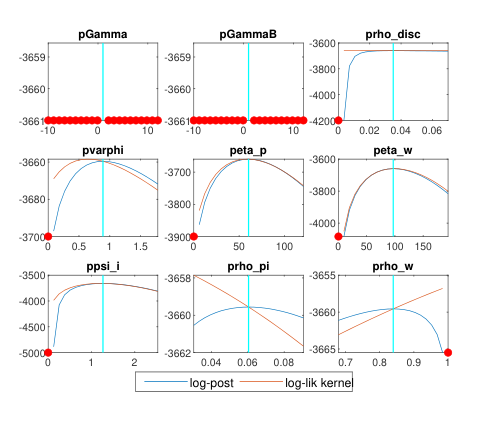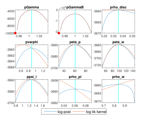 I am using mode_compute=5. One thing I noticed was that the mode_check_plots were extremely different even though the numerical results were essentially unchanged (third decimal differences), both for “Final value of minus the log posterior” and the mode/s.d. in “RESULTS FROM POSTERIOR ESTIMATION”. It seems that the previous versions of Dynare were able to “zoom in” on nondegenerate regions of determinacy, but version 7 just defaults to a x-axis bounds of [-10, 10]. See the images below, for v6.4 and v7.0.If you squint hard enough, you can see that the cyan lines are identical in the two figures.